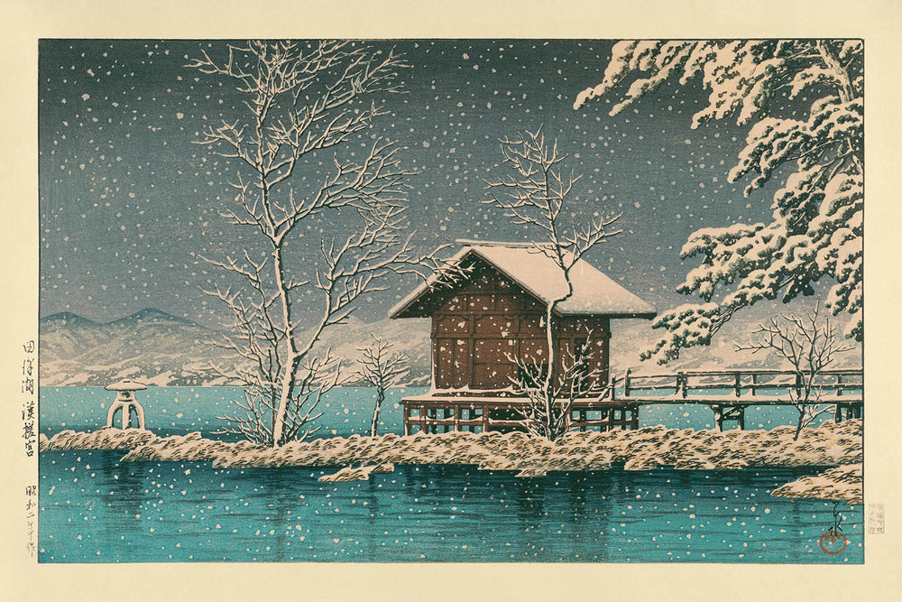 Santuario Kansagu en el Lago Tawaza en la Nieve por Hasui Kawase, 1935