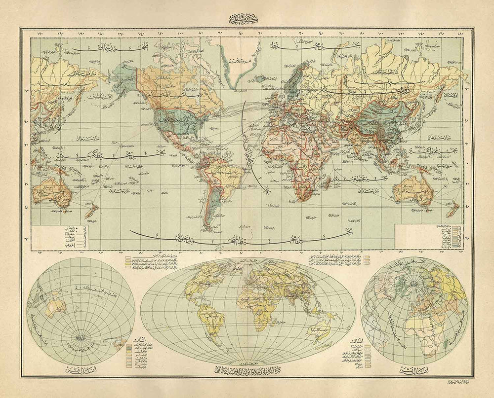 Antiguo mapa árabe del mundo realizado por Hafiz Ali Esref en 1893: América, Gran Bretaña, Australia, Arabia, Marruecos