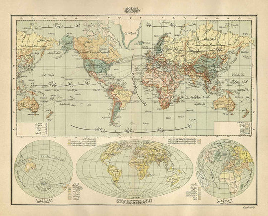 Este maravilloso viejo mapa de un Mapa Mundial en lengua árabe fue publicado originalmente en 1893. Fue creado por Hafiz Ali Esref.