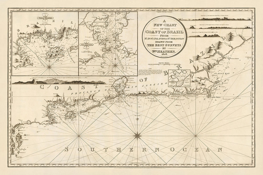 Este excepcional mapa náutico, titulado "Un Nuevo Mapa de la Costa de Brasil Desde la Isla de San Ana hasta San Sebastián," es un testimonio del meticuloso trabajo de William Heather, un renombrado hidrografista y cartógrafo británico del principio del siglo XIX. Creado en 1802 y publicado en 1808, este mapa captura un momento crucial en la historia marítima, coincidiendo con el año en que la familia real portuguesa se trasladó a Río de Janeiro en medio de las Guerras Napoleónicas. Heather, conocido por sus precisos y detallados mapas náuticos, utilizó encuestas realizadas por la Armada Portuguesa, ofreciendo una precisión sin igual en la representación de la costa brasileña durante un tiempo en que la región era un centro crucial para las actividades marítimas británicas y americanas.