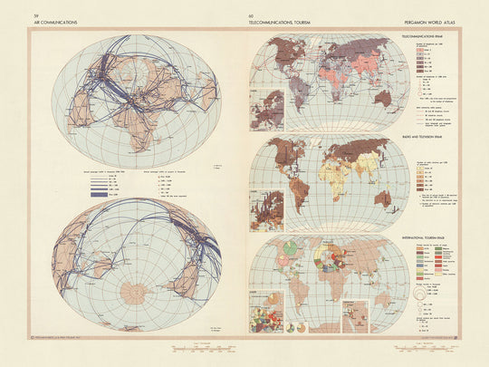 El 'Comunicaciones Aéreas Mundiales. Telecomunicaciones, Turismo.' map es un testimonio notable del poder de la visualización de datos. Las infografías del mapa se presentan de una manera estéticamente agradable e informativa, transmitiendo de manera efectiva información compleja en un formato accesible. El estilo temático del mapa es particularmente eficaz a la hora de ilustrar la interconexión del mundo en una época en la que el concepto de "aldea global" estaba empezando a tomar forma. La forma en que se muestran los datos permite una comprensión más profunda de las diversas facetas de la comunicación y los viajes globales, destacando la intrincada red de rutas aéreas y la floreciente industria turística de la época.