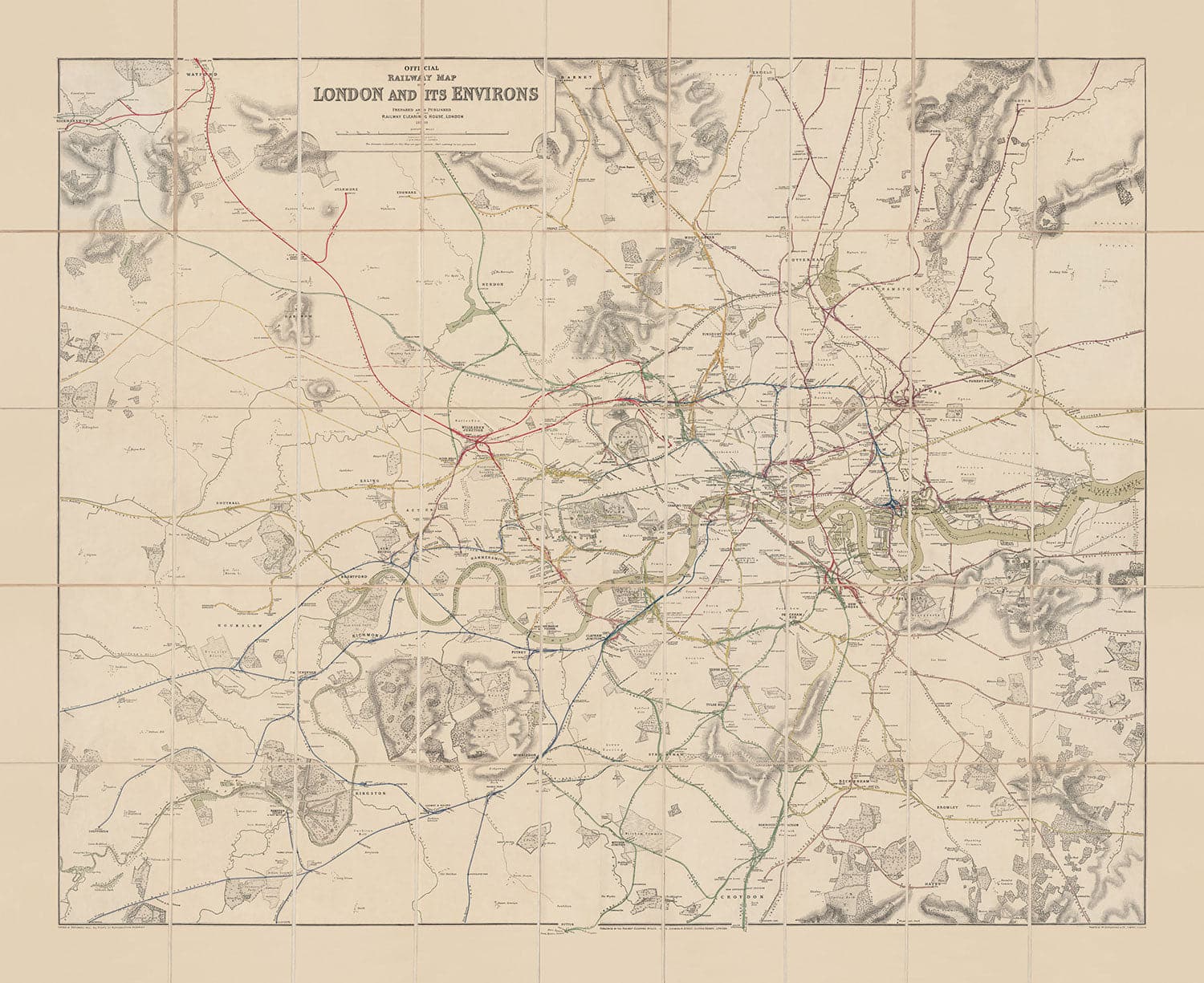 Este mapa te muestra cuán avanzados ya estaban los ferrocarriles de Londres a finales del siglo XIX. Aquí se pueden ver algunas de las primeras líneas del metro (la línea Metropolitan, de color azul claro), pero en su mayoría son líneas que más tarde se convertirían en el London Overground y varias líneas de National Rail.