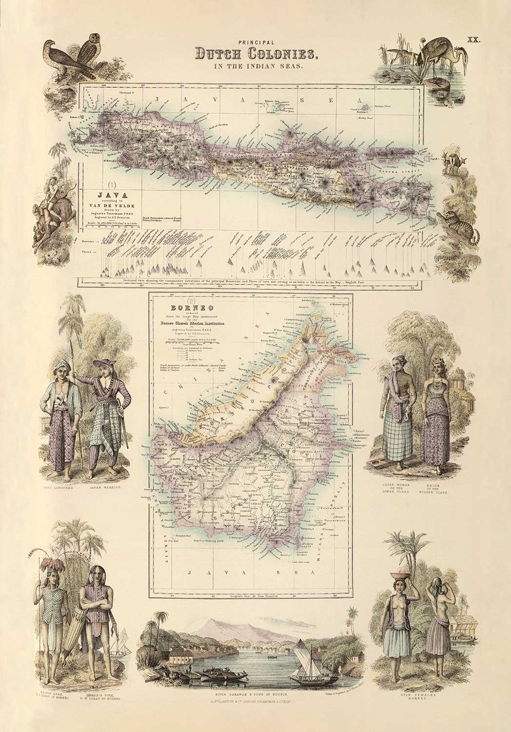 El mapa muestra la isla de Java y Borneo en el momento de la administración de la Compañía Neerlandesa de las Indias Orientales, con ilustraciones alrededor del mapa que muestran el paisaje, la fauna y la población de los isleños.