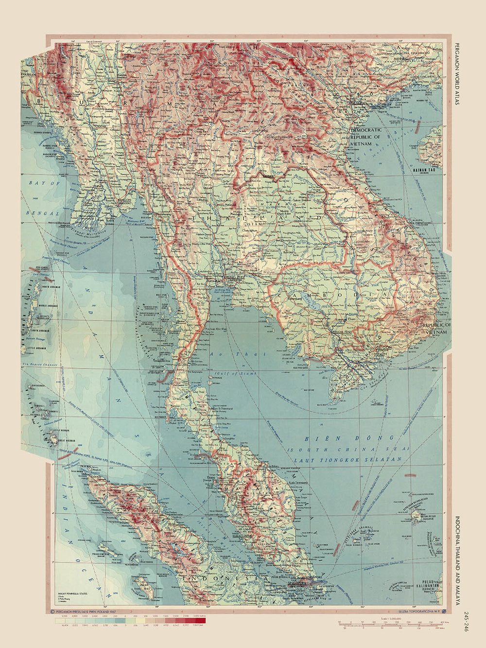 Este mapa de 1967 de Indonesia, Tailandia y Malaya, publicado por el Servicio de Topografía del Ejército Polaco, es un mapa político y físico detallado que proporciona una visión completa de la región. El mapa está centrado en la península de Malaya, con Tailandia al noroeste y Malasia al suroeste. El mapa abarca la mayor parte del sudeste asiático, incluyendo Vietnam, Camboya, Birmania, etc.