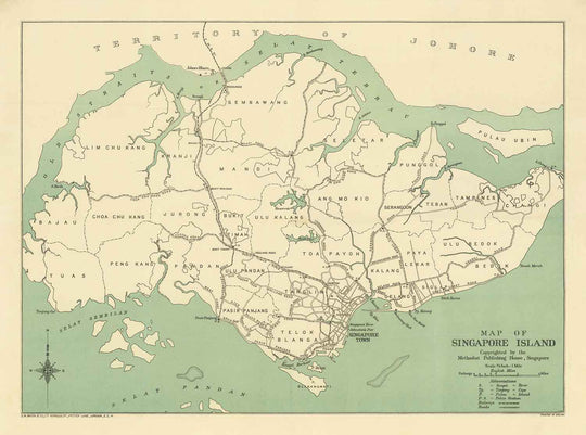 Antiguo mapa de la isla de Singapur, 1920: Carreteras, ferrocarril, Sembawang, Tampines, Tuas, Johor Bahru, Malasia