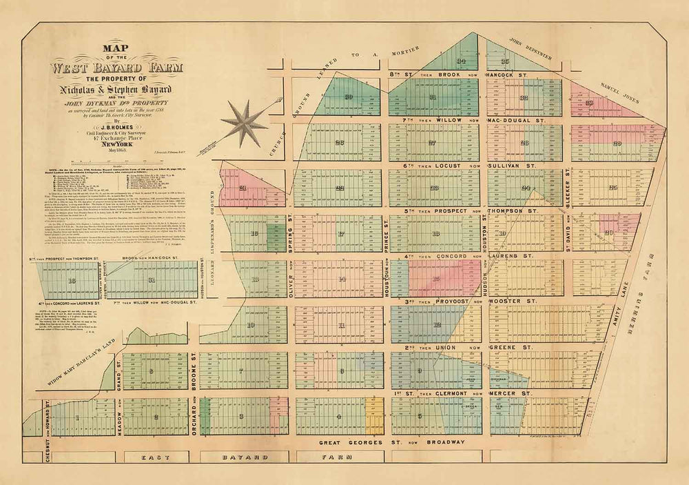 Mapa antiguo del SoHo, NYC, 1868 por John Bute Holmes: Estudio de las tierras de cultivo de Manhattan, Broadway, Bleeker, Houston St