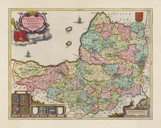 Antigua mapa de Somerset en 1665 por Joan Blaeu: Bath, Bristol, Portishead, Weston-super-Mare, Taunton, Yeovil