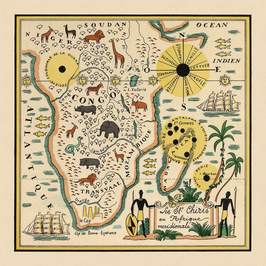 Mazuyer, conocido por sus conocimientos históricos, colaboró con el ilustrador Lucien Boucher para crear un mapa que es a la vez informativo y visualmente impactante. El mapa está adornado con ilustraciones de animales autóctonos, como leones, elefantes y jirafas, que dan vida al paisaje africano. Estos elementos artísticos se complementan con una rosa de los vientos decorativa y representaciones de majestuosos barcos navegando por los océanos Atlántico e Índico, lo que realza el atractivo del mapa e invita a los espectadores a explorar sus intrincados detalles.