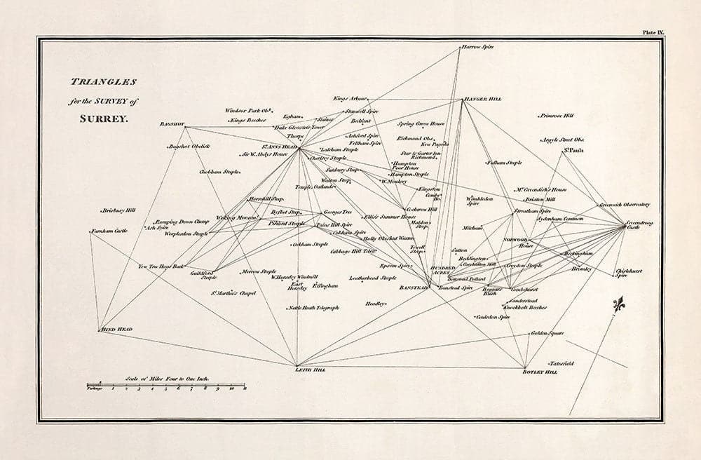 Este es literalmente un mapa de triángulos, pero son triángulos muy importantes. Son triángulos muy precisos entre varios puntos de Surrey, medidos utilizando teodolitos.