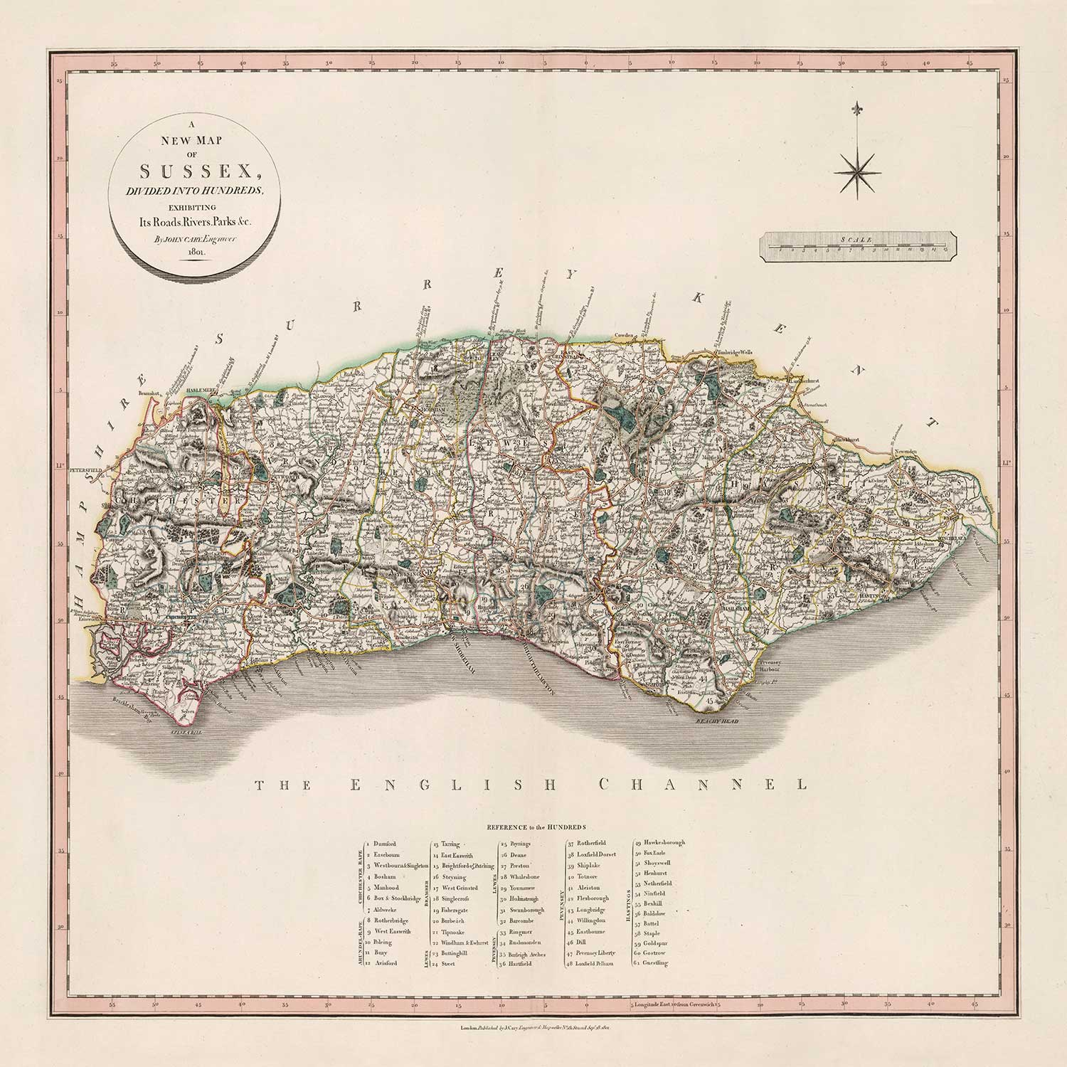 Este maravilloso mapa antiguo de Sussex fue publicado originalmente en 1801. Fue creado por John Cary.