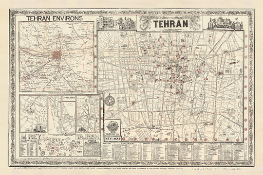 Este hermoso y detallado mapa de Teherán de Sahab Abbas ofrece una visión fascinante del pasado de la ciudad. Creado originalmente en 1956, este mapa muestra la ciudad con gran detalle, con sus numerosas calles, barrios y puntos de referencia claramente marcados. Aquí están las cinco cosas más importantes que se muestran en este mapa: