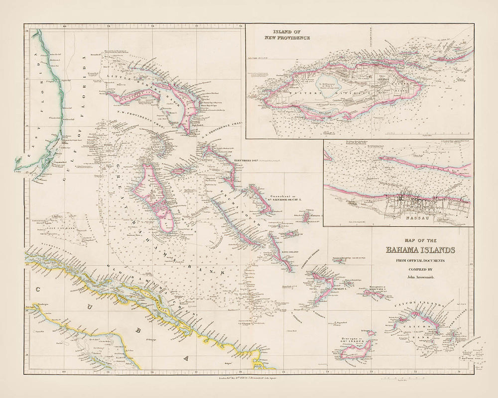 Mapa antiguo de las Bahamas de Arrowsmith, 1858: Nassau, New Providence, canales, bancos, costas