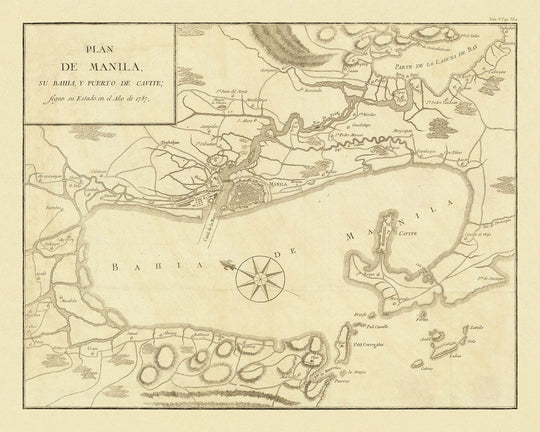 Descubre el cautivador atractivo del "Plan de Manila, su Bahía y Puerto de Cavite; según su Estado en el Año de 1787," una obra maestra creada por Pedro de Góngora y Luján, Duque de Almodóvar, en 1790. Este exquisito mapa ofrece una visión detallada del vibrante paisaje urbano de Manila y su bahía circundante durante una era crucial en la historia. El meticuloso diseño del mapa está arraigado en la tradición cartográfica del trabajo anterior del Padre Pedro Murillo Velarde, reflejando un rico tapiz de características políticas y físicas que definen esta región icónica.