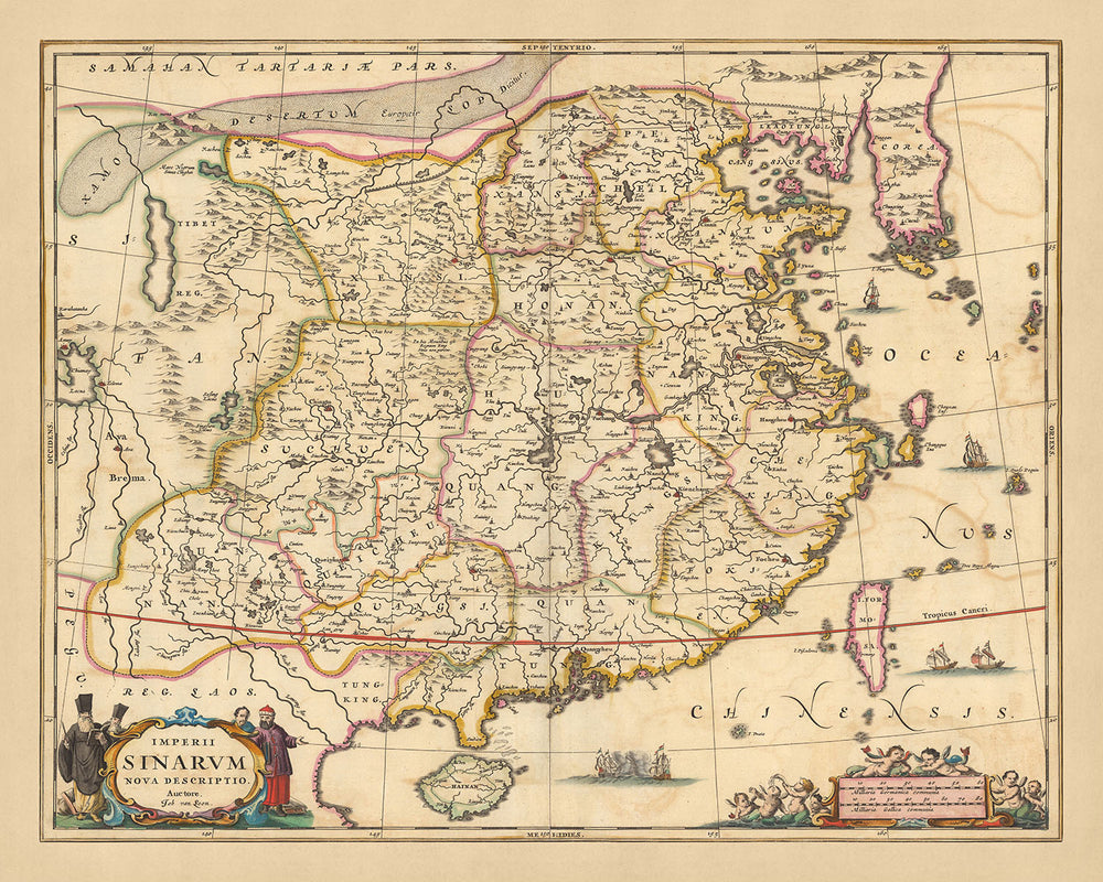 Sumérgete en el rico tapiz de la historia con el 'Imperii Sinarum Nova Descriptio Auctore Joh van Loon', una extraordinaria obra maestra cartográfica de finales del siglo XVII. Traducido al inglés, el título de este mapa es 'Nueva descripción del imperio chino por Joh van Loon'. Elaborado por Nicolaes Visscher II en 1690, este mapa es un testimonio de la Edad de Oro holandesa de la cartografía, un período conocido por sus mapas precisos y estéticamente agradables. Visscher II, nieto del renombrado cartógrafo Claes Janszoon Visscher, continúa la tradición familiar de crear mapas intrincados y detallados.