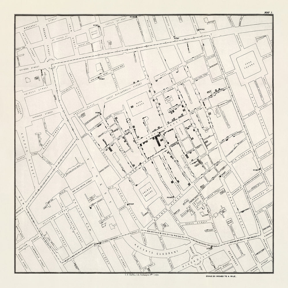 John Snow, un pionero en el campo de la epidemiología, utilizó este mapa para demostrar la importancia del suministro de agua potable en la prevención de brotes de enfermedades. Su enfoque innovador para mapear y analizar datos sentó las bases de los métodos epidemiológicos modernos. El mapa no sólo destaca la ubicación de las bombas de agua, sino que también proporciona una vista detallada de las calles y manzanas de la ciudad del Londres del siglo XIX, ofreciendo una visión del paisaje urbano de la época. El trabajo de Snow es un testimonio del poder de la visualización de datos en la salud pública.