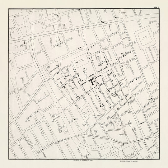 El diseño y el estilo de este mapa son funcionales e informativos, lo que lo convierte en una pieza valiosa para cualquier persona interesada en la historia de la medicina, la salud pública o la cartografía. El mapa está orientado con el norte en la parte superior y la escala es de 30 pulgadas a una milla, lo que proporciona una representación clara y precisa del área. Los nombres detallados de las calles y la cuidadosa ubicación de las marcas negras y las bombas de agua crean una narrativa visual convincente del brote de cólera, lo que la convierte en una herramienta esencial para comprender el contexto histórico de la epidemia.