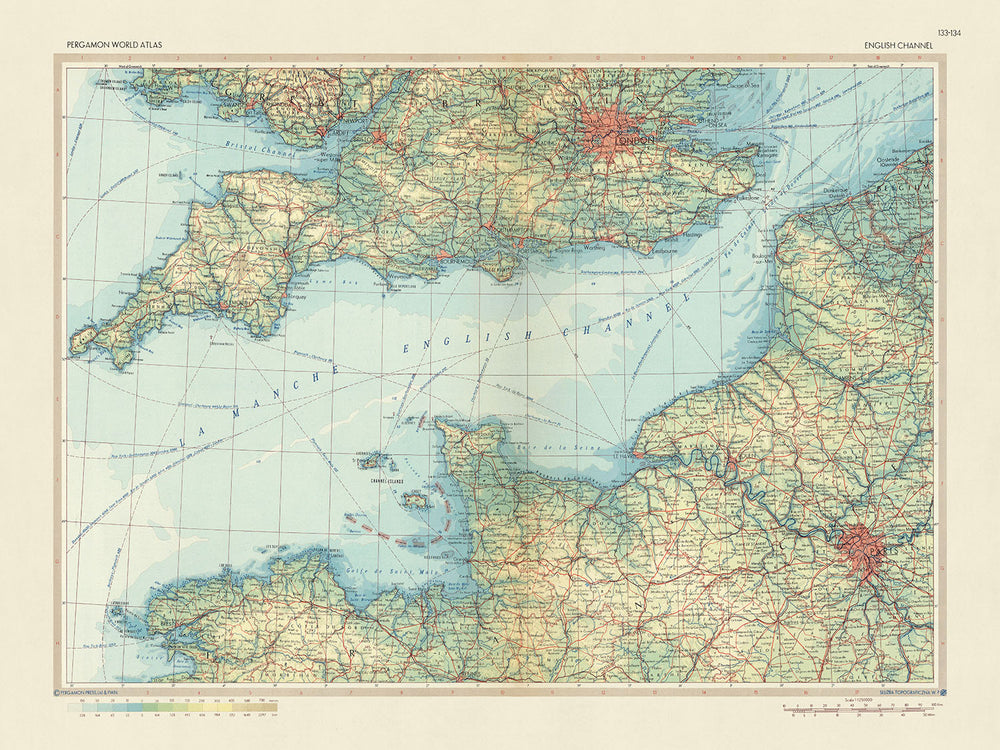 La representación del sur de Inglaterra en el mapa es completa y precisa, capturando la topografía y las fronteras políticas distintivas de la región. La bulliciosa ciudad de Londres, con su rica historia y diversidad cultural, se destaca, proporcionando una fascinante visión de la disposición geográfica de la ciudad durante mediados del siglo XX. De manera similar, la representación del noroeste de Francia en el mapa es igualmente detallada, con un énfasis particular en la icónica ciudad de París, conocida por su atractivo romántico y grandeza arquitectónica.