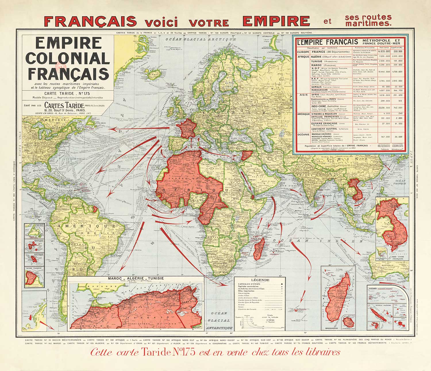 Antiguo Mapa del Imperio Colonial Francés, 1938 por Taride: Francia, Napoleón, África del Norte, Rutas Marítimas