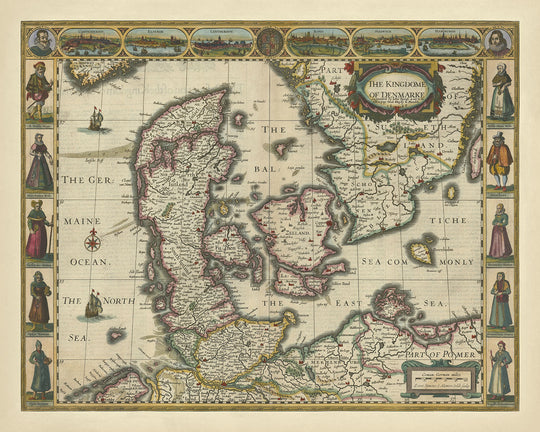 Una de las características más llamativas de este mapa es la representación de lugares y ciudades notables. Copenhague, Elsinore, Hamburgo y Schleswig están ilustradas con notable detalle, ofreciendo una visión de los centros urbanos de la época. Estas ciudades no sólo eran centros políticos y económicos, sino también centros culturales que desempeñaron un papel importante en la configuración de la historia de la región. Las viñetas sobre el mapa brindan un recorrido visual por estos lugares importantes, agregando profundidad y contexto a la información geográfica presentada.