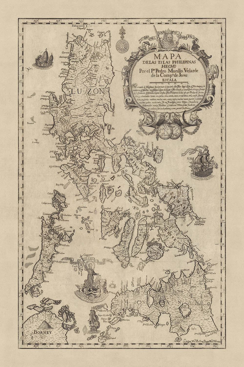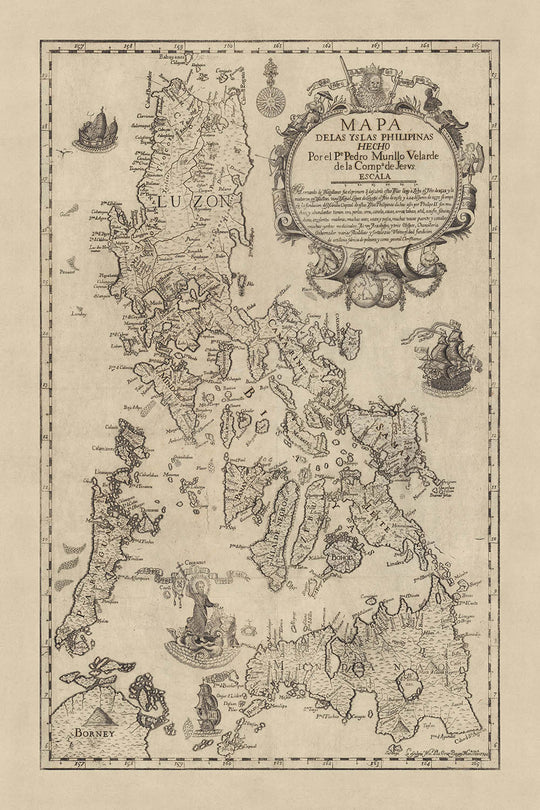 El mapa cubre meticulosamente todo el archipiélago filipino, extendiéndose desde los límites norteños de Luzón hasta la isla sureña de Mindanao, y hacia el oeste hasta Palawan. También incluye partes de la cercana Borneo, visible en la esquina inferior izquierda. Esta cobertura integral muestra la diversa geografía de la región, desde sus numerosas islas y complejas costas hasta sus cadenas montañosas y cuerpos de agua. El Mar de Sulu, destacado, sirve como telón de fondo para una de las viñetas más llamativas del mapa, añadiendo tanto valor artístico como geográfico.