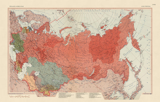 Este mapa es una fascinante exploración de la geografía de la URSS, con la vasta extensión del Océano Ártico destacándose de manera prominente. El océano, un componente significativo de la frontera norte de la Unión Soviética, se representa con un detalle notable, reflejando el compromiso del cartógrafo con la precisión geográfica. Este elemento añade una capa adicional de interés al mapa, ya que resalta la posición estratégica de la URSS y sus vínculos inherentes con la región ártica más amplia.
