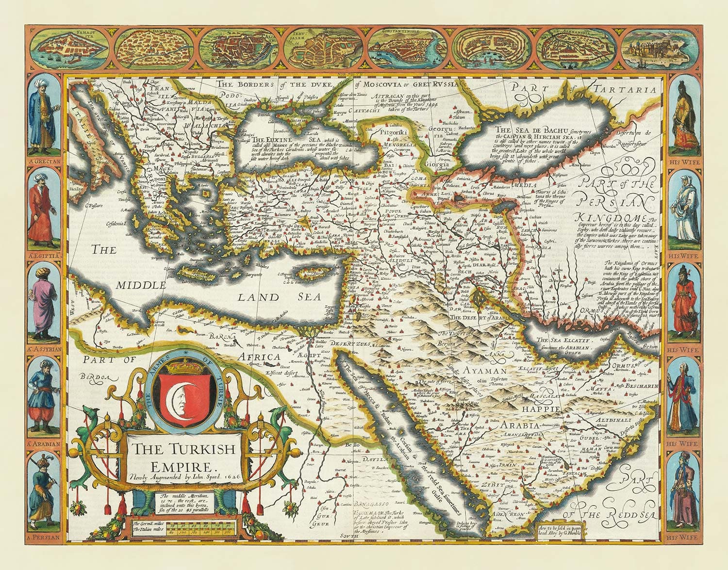 Viejo Mapa del Imperio Turco / Otomano por John Speed, 1627: Turquía, Balcanes, Grecia, Irán, Egipto, Siria