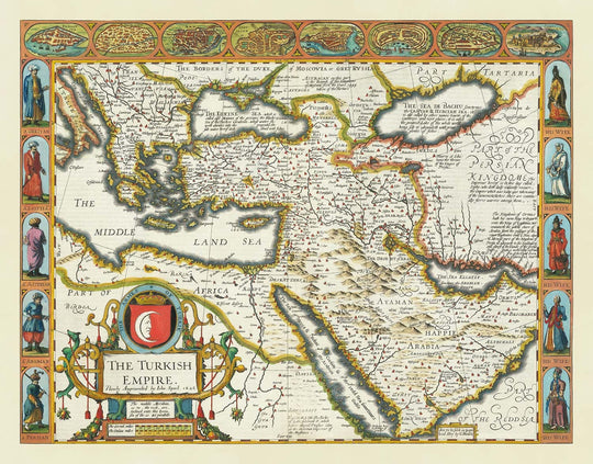 Alrededor del borde del mapa son hermosas viñetas de los ciudadanos del Imperio Turquio y vistas detalladas de las principales ciudades como Estambul, Damasco y Alejandría.