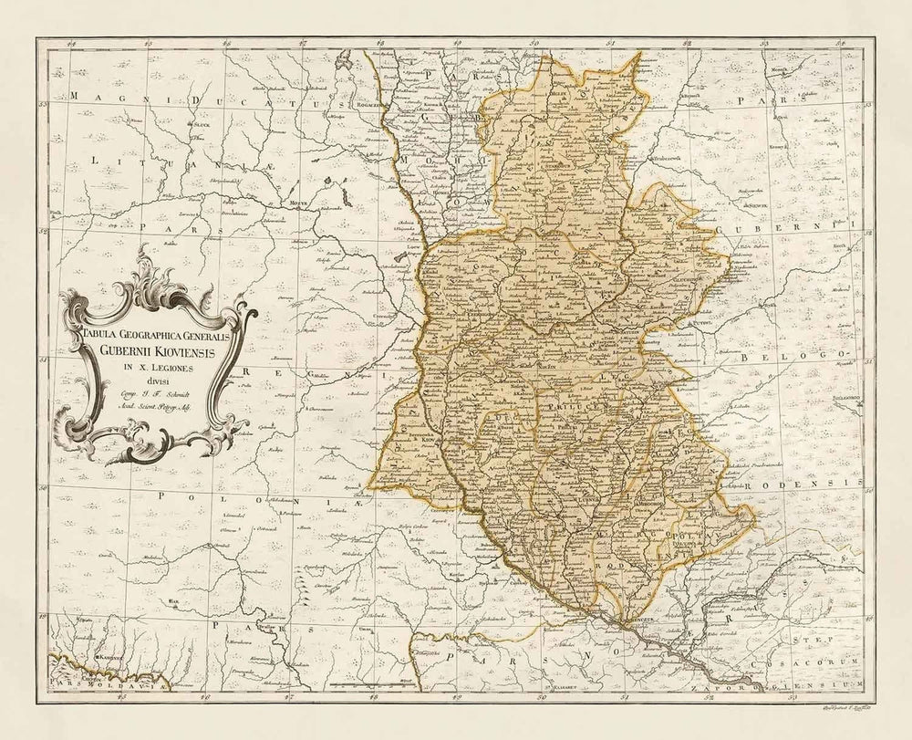 Un hermoso mapa de la Gobernación de Kiev (Guberniya), publicado originalmente en 1770 por Jakob Friedrich Schmidt de San Petersburgo. En ese momento, Kiev era principalmente una región autónoma, pero 5 años después, en 1775, Catalina la Grande de Rusia aboliría su autonomía y absorbería completamente la región como parte del Imperio Ruso.