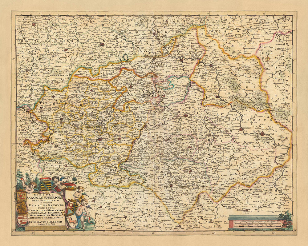 Magdeburgo, una de las ciudades más antiguas de la parte oriental de Alemania, también ocupa un lugar destacado. La ciudad fue una importante ciudad medieval y su representación en el mapa subraya su importancia durante el período. También se representan Halle (Saale), conocida por su rica producción de sal, y Erfurt, con su paisaje urbano medieval bien conservado, lo que aumenta el valor histórico del mapa.