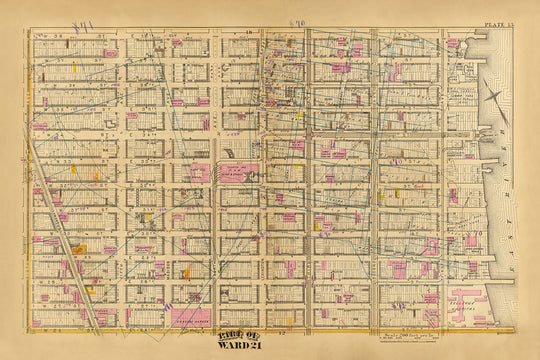 Este mapa histórico de 1879 presenta una vista detallada de parte del Distrito 21 en la ciudad de Nueva York, meticulosamente documentada por el notable cartógrafo GW Bromley. El mapa, una litografía coloreada a mano, proporciona una representación vívida del diseño urbano de la época, ilustrando edificios, bocas de incendio y los sistemas de tránsito, incluidos los tranvías y el vapor. Es un ejemplo excepcional de la artesanía de la época, que captura la intrincada cuadrícula de calles y avenidas junto con infraestructuras notables como tuberías de agua y dimensiones de bloques.