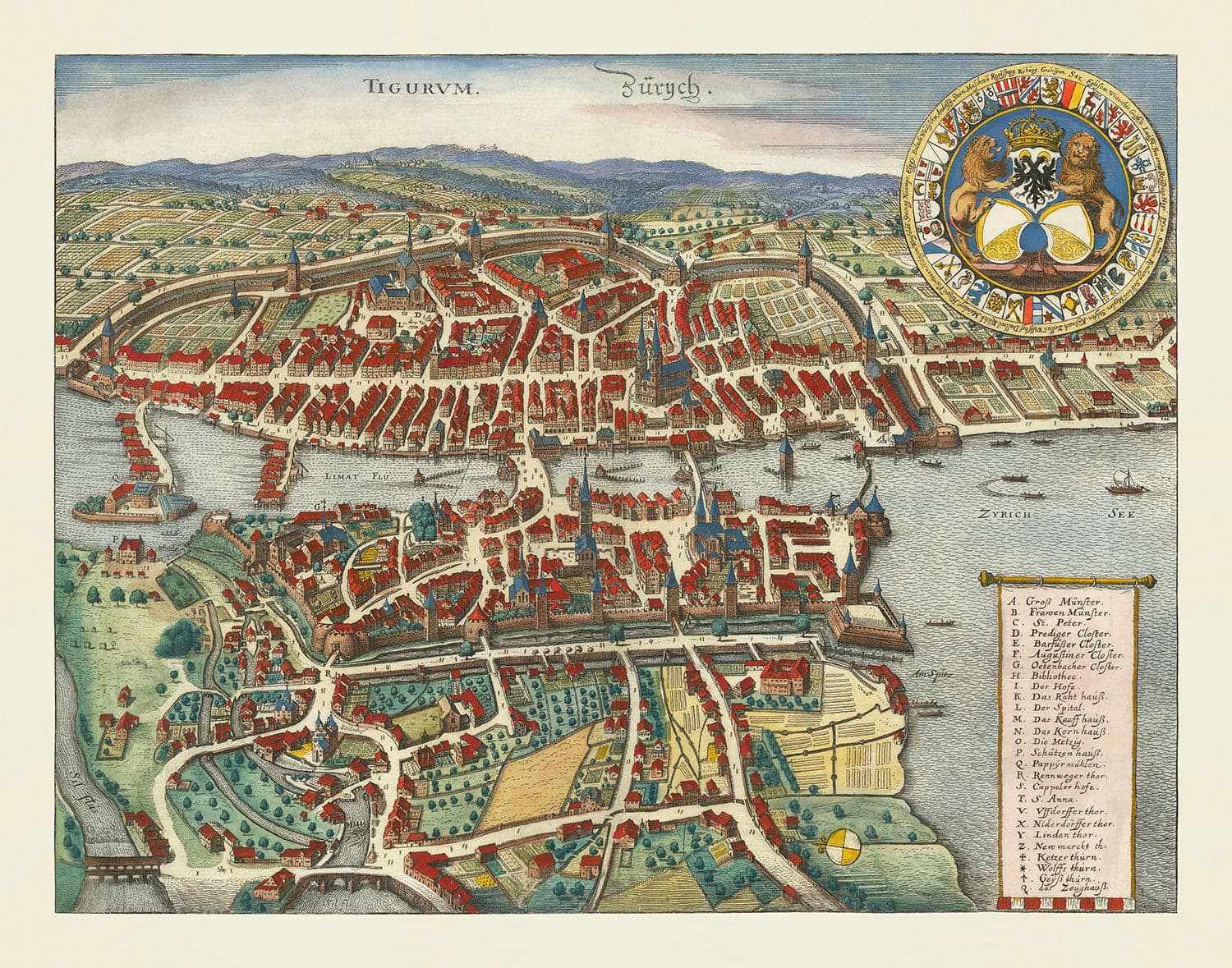 El mapa en sí es bastante impresionante, con el río Limmat, puentes y el lago de Zúrich dominando el centro del marco. También puedes reconocer algunas otras partes de la ciudad, como las iglesias. Sin embargo, la imponente muralla de la ciudad fue demolida en el siglo XIX.
