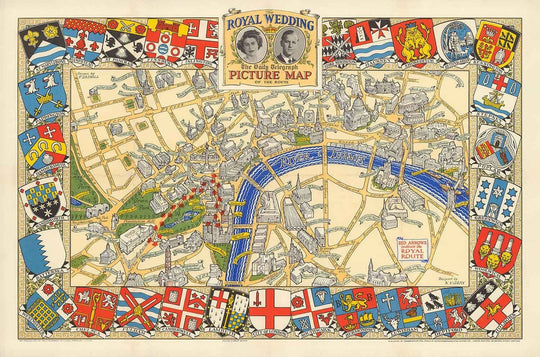 Mapa antiguo de la Boda Real en Londres, 1947: Emblemas del municipio, Reina Isabel II y Príncipe Felipe, Abadía de Westminster