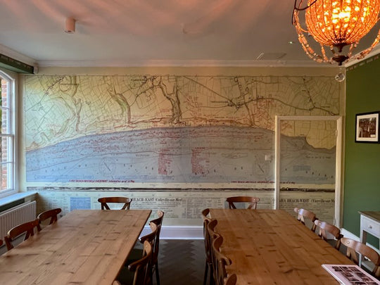 Emitidos menos de un mes antes del Día D y con la clasificación ultra secreta "BIGOT", estos mapas fueron fundamentales en la planificación y ejecución de la invasión aliada de Normandía. El mapa base es un mapa topográfico familiar, con carreteras y áreas construidas en negro, verde que indica diferentes tipos de vegetación; y marrón que indica elevaciones y características topográficas, incluyendo los acantilados empinados que dominan la playa. Una variedad de líneas discontinuas en el agua indican profundidades en mareas bajas (marrón) y altas (azul).