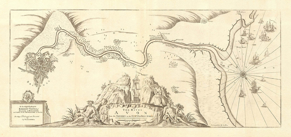 Step into the world of 18th-century navigation with Captain Greenvile Collins’ masterful chart, “The River Avon from the Severn to the Citty of Bristoll.” This exquisite map, created in 1774, captures the winding journey of the River Avon as it meanders from the broad Severn Estuary to the bustling heart of Bristol. Oriented with the south at the top—a charming quirk of period cartography—the map immerses the viewer in the landscape as it was known to merchants, mariners, and explorers of the age. The dedication to Robert Yate, Mayor of Bristol and Master of the Merchants Hall, underscores the map’s deep connection to the city’s mercantile heritage and its vital role in British maritime commerce.