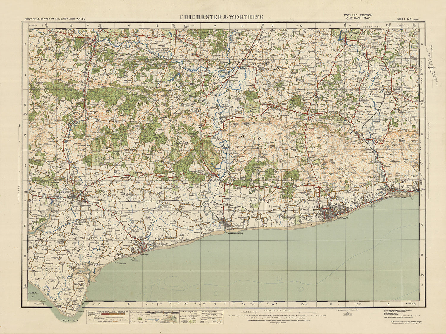 Este mapa antiguo, titulado "Hoja 133 - Chichester y Worthing", es parte de la edición "Popular" de una pulgada de Inglaterra y Gales de Ordnance Survey, publicada en 1925. Proporciona una visión fascinante del pasado, mostrando los pueblos y ciudades. y características interesantes de la región de Chichester y Worthing. El mapa cubre un área rica en historia, ubicada en el histórico condado de Sussex.