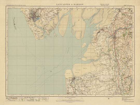 Este antiguo mapa de Ordnance Survey, Hoja 24 - Lancaster y Barrow, de la edición "Popular" de una pulgada, Inglaterra y Gales, publicado en 1925, es una fascinante pieza de historia cartográfica. El mapa muestra las ciudades de Lancaster y Barrow, junto con las zonas circundantes, como Morecambe, Fleetwood, Garstang, Heysham y Pilling. Ofrece una visión única del paisaje y los asentamientos de esta región a principios del siglo XX.