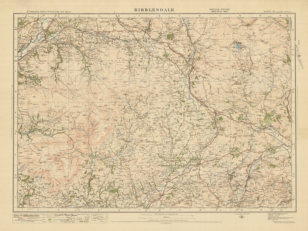 Este mapa antiguo, titulado "Sheet 25 - Ribblesdale", es una cautivadora pieza de la edición "Popular" de una pulgada del Ordnance Survey, Inglaterra y Gales, publicada en 1925. El mapa muestra el histórico condado de Ribblesdale, situado en la pintoresca región del norte de Inglaterra. Ofrece un fascinante vistazo al pasado, presentando una gran cantidad de pueblos, ciudades y características notables que fueron prominentes durante esa época.