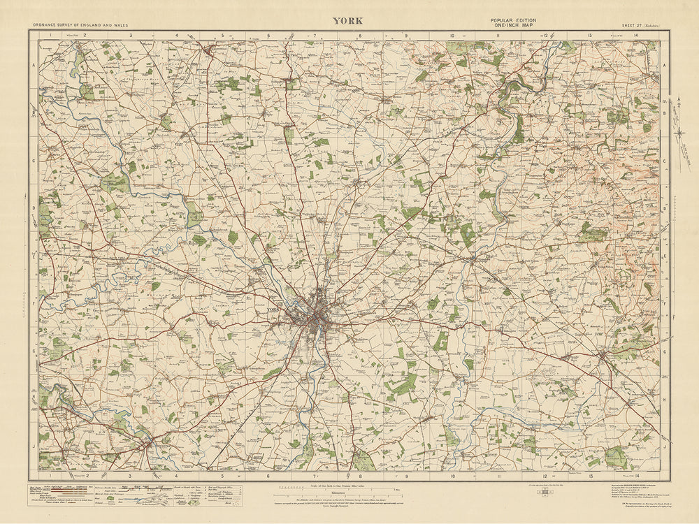 Explore el Mapa Antiguo de Ordnance Survey, Hoja 27 - York, 1925, y adéntrese en el tapiz histórico de esta cautivadora región, descubriendo sus ciudades, ríos y acontecimientos significativos que dieron forma a su pasado.
