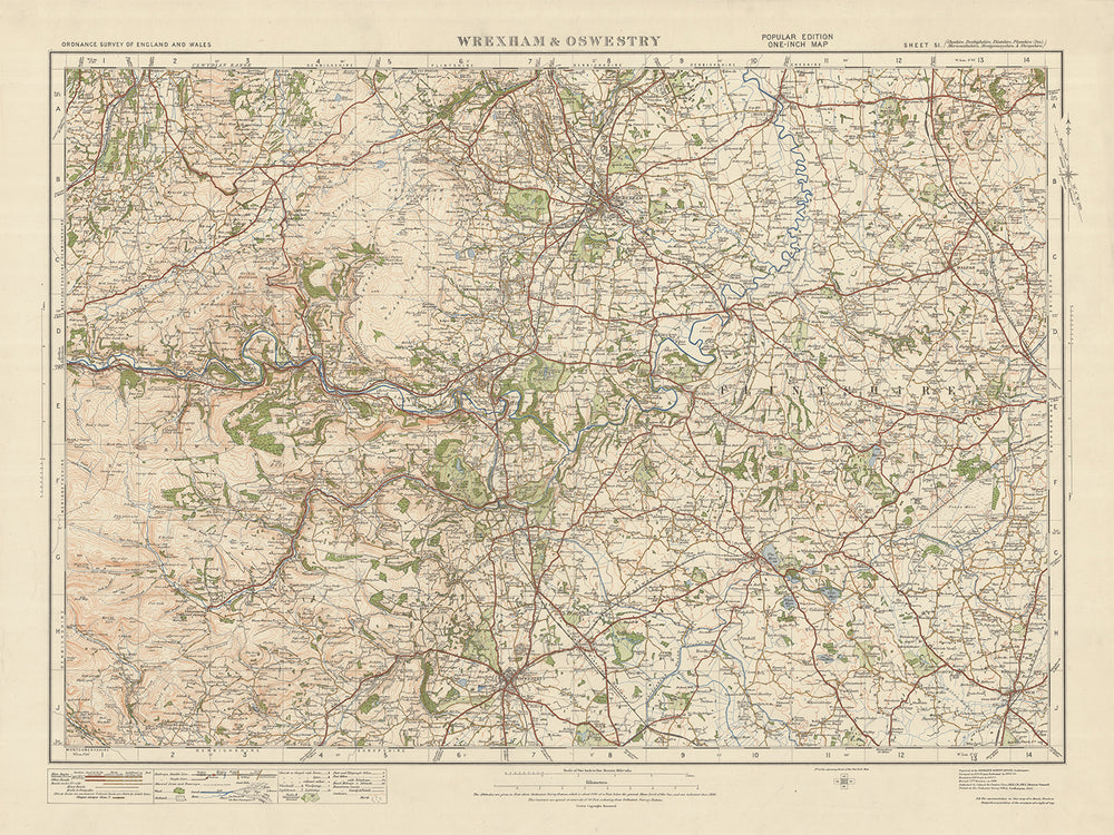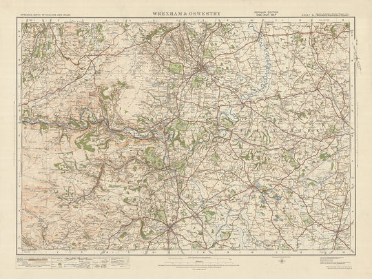 El mapa "Hoja 51 - Wrexham & Oswestry" de la edición "Popular" de una pulgada de Ordnance Survey, Inglaterra y Gales, publicado en 1925, es una pieza notable de la historia cartográfica. Este mapa meticulosamente detallado muestra las ciudades de Wrexham y Oswestry, junto con otros asentamientos notables como LLangolen, Wem, Ellesmere y Malpas.