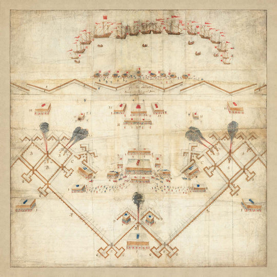 Notablemente, el diseño captura la dicotomía de la guerra mecanizada en medio de su entorno natural: los bloqueos navales se curvan hacia la costa, mientras los regimientos se mueven a través de un paisaje en retroceso. Las ilustraciones de fortificaciones y etiquetas narran un teatro en evolución de compromiso militar, completo con caminos anotados y trincheras curvadas — motivos no solo de defensa, sino de abandono estratégico. A medida que las letras A-L insinúan una narrativa más amplia probablemente discutida en círculos esotéricos de los ministros de la Reina Isabel, el mapa sirve como un artefacto de la interacción entre el evento histórico y la representación artística.