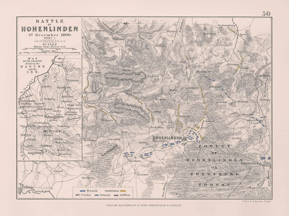 AK Johnston es reconocido en el mundo de la cartografía, y se destaca por sus excepcionales trabajos que capturaron importantes narraciones históricas y exploraciones geográficas. La litografía de la Batalla de Hohenlinden es resplandeciente con detalles visuales e históricos, mostrando acertadamente las formaciones estratégicas de los ejércitos francés y austríaco, vívidamente cromáticas dentro de los confines de la caballería, la infantería y la artillería, todo ello mostrado contra el terreno extenso con distinguida habilidad y precisión.