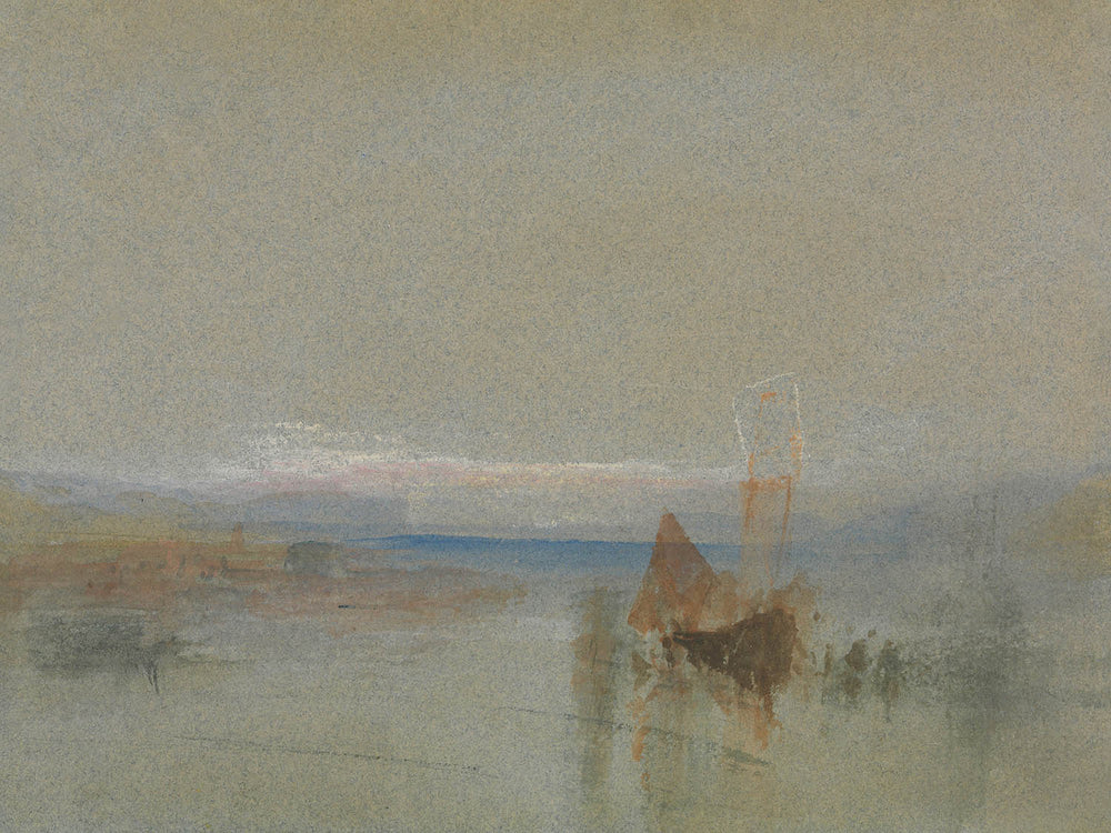 Turner, a menudo llamado "el pintor de la luz", fue uno de los artistas románticos más destacados de Gran Bretaña, conocido por sus técnicas pioneras y su influencia en el Impresionismo. Su fascinación por el mar, los barcos y el clima cambiante continúa cautivando a los espectadores hasta el día de hoy. Esta pintura en particular, compuesta a principios del siglo XIX, muestra la temprana maestría de Turner en los efectos atmosféricos y su capacidad para infundir configuraciones aparentemente simples con emoción poética.