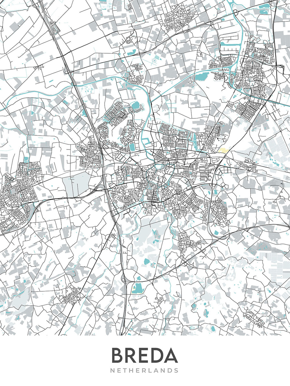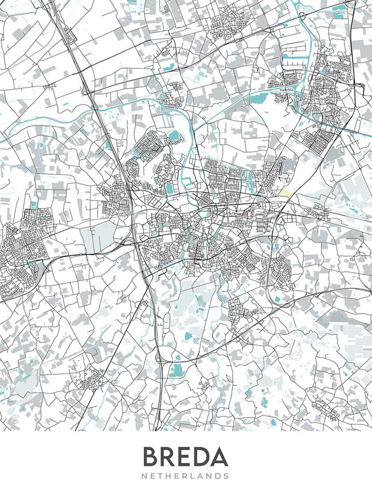 Este mapa de Breda es un callejero moderno y detallado sin etiquetas. Es un mapa rectangular centrado en la ciudad de Breda en la región más grande de los Países Bajos. El mapa cubre un área amplia, incluido el centro de la ciudad y muchos de los barrios circundantes. Algunos de los barrios notables incluidos en el mapa son Breda Centrum, Belcrum, Haagpoort, Valkenberg, Zandberg, Ginneken, Bavel, Prinsenbeek, Teteringen y Ulvenhout.