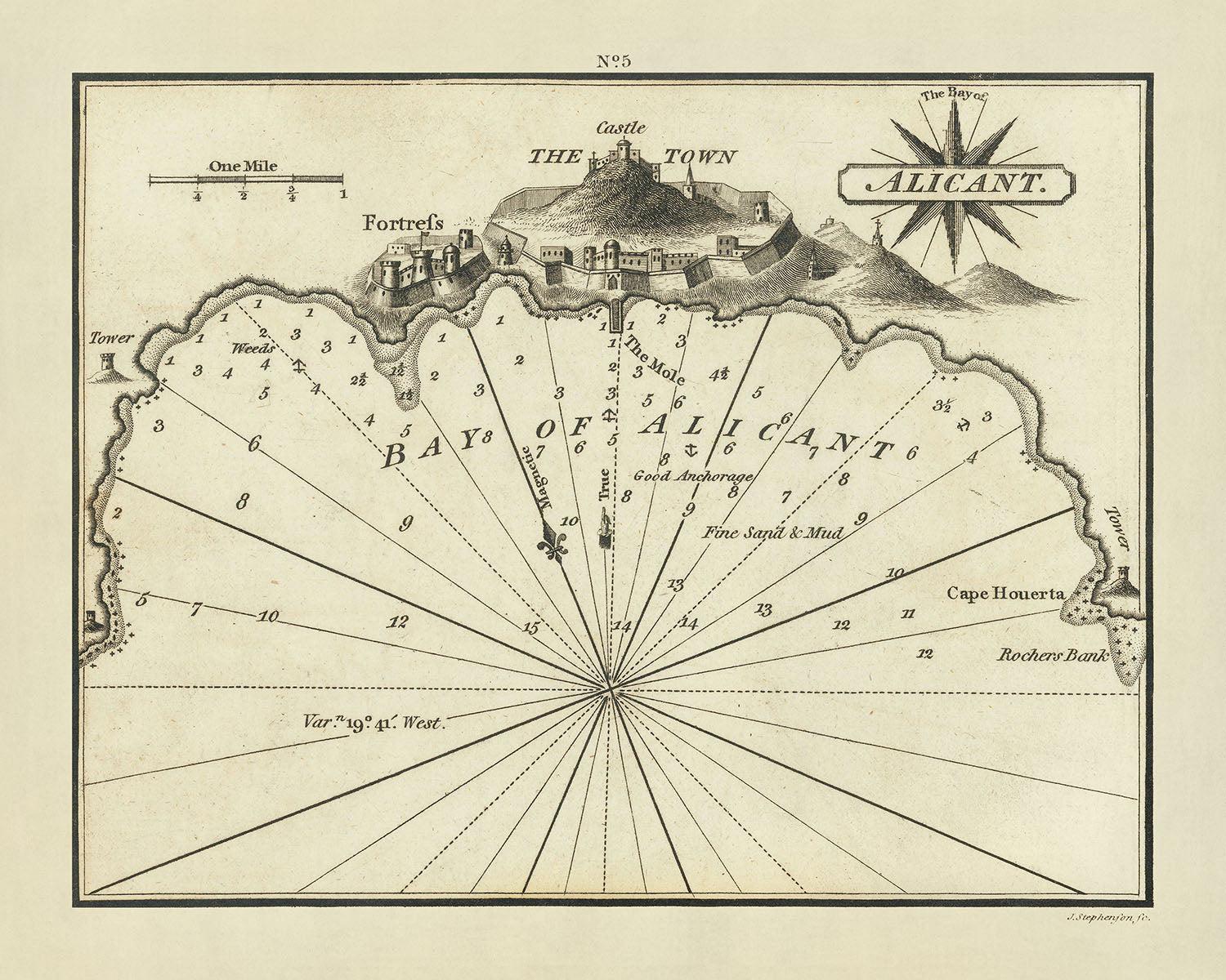 "La Bahía de Alicant" no es solo una herramienta de navegación, sino un artefacto cultural, capturando un momento en la rica historia marítima del Mediterráneo. Su creación durante un período en el que los cartógrafos ingleses comenzaban a competir con sus contrapartes europeas añade capas de significado histórico y geopolítico. Este mapa es un testimonio de las técnicas en evolución en hidrográfica y del creciente interés en los puertos mediterráneos, que fueron fundamentales para el comercio y las empresas militares durante el período. Poseer este mapa es como poseer una pieza de la historia marítima, invaluable para coleccionistas y académicos por igual.