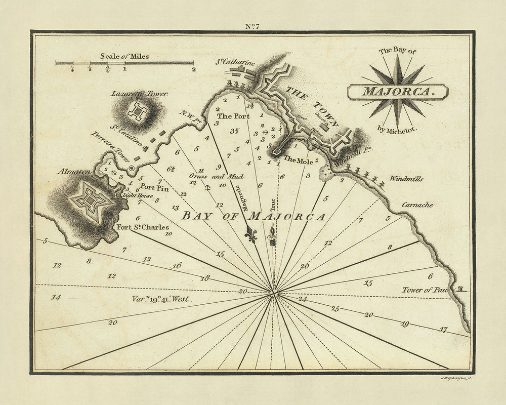 Esta carta es particularmente valiosa por su representación de características marítimas y topográficas clave. Detalla sondas, anclajes y ayudas a la navegación como rosas de los vientos y barras de escala, esenciales para los marineros que navegan por estas aguas a principios del siglo XIX. La inclusión de representaciones pictóricas de pueblos y fortalezas, notablemente alrededor de Palma, la vibrante capital de Mallorca, añade una capa de profundidad visual y contexto histórico, convirtiéndola en una fascinante instantánea de los detalles geográficos y militares de la época.