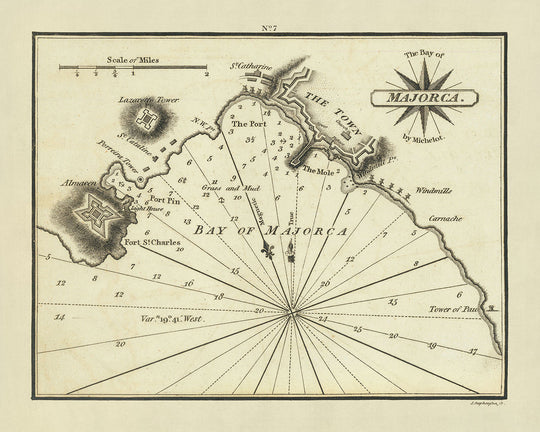 Carta Náutica de la Bahía Vieja de Mallorca por Heather, 1802: Torre Lazarette, Torre Porreira, Almacén