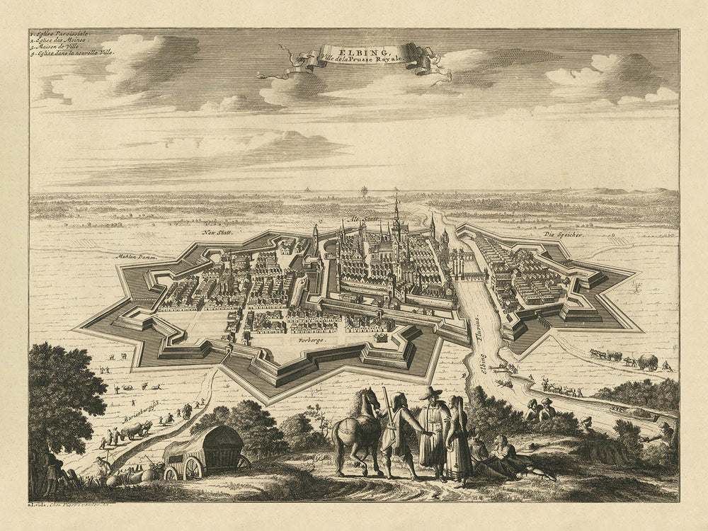 - Decorative ribbon cartouche with the title "Elbing, Ville de la Prusse Royale"
