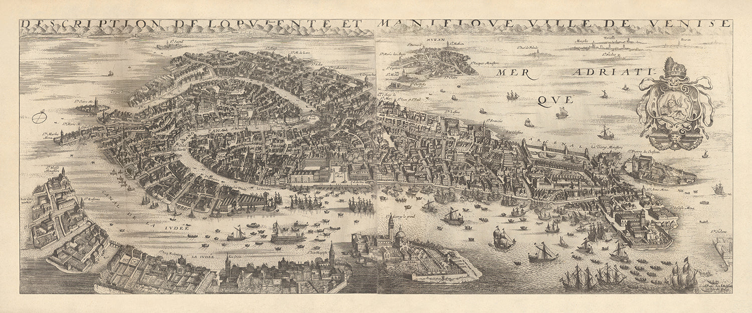 Venecia, famosa por su intrincada red de canales y su impresionante arquitectura, está bellamente representada en este mapa. Lugares notables como la Basílica de San Marcos, el Palacio Ducal y el icónico Puente de Rialto son fácilmente identificables y muestran el rico patrimonio cultural de la ciudad. El Gran Canal, una vía fluvial vital que se abre al mar Adriático, está representado con numerosos barcos veleros y mercantes, lo que refleja el próspero comercio de Venecia durante el siglo XVII. Los barcos más pequeños y las góndolas que navegan por las islas y canales realzan aún más la autenticidad y el encanto del mapa.