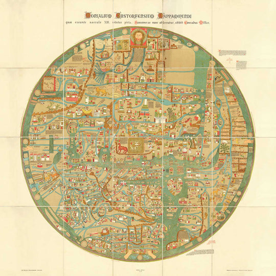 Sumérgete en los intrincados detalles del mundo del siglo XIII con este mapa meticulosamente elaborado, centrándose en la región del Mediterráneo y más allá. Esta reproducción del Ebstorf Mappa Mundi ofrece una visión única de las percepciones y el conocimiento geográfico de la Edad Media, que cobró vida gracias a un cartógrafo anónimo. El mapa, publicado originalmente en el siglo XIII, es un testimonio del arte y la ambición de los cartógrafos medievales, y proporciona una pieza atractiva y educativa para cualquier entusiasta de la historia o los mapas.