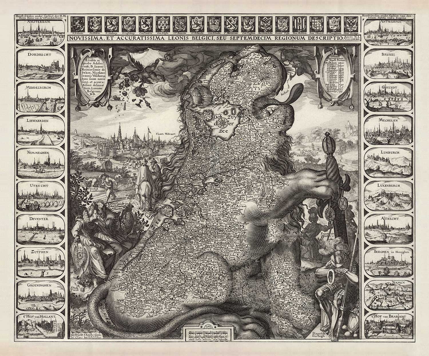 El Leo Belgicus era un diseño de mapa con forma de león que presentaba los actuales Países Bajos, Bélgica, Luxemburgo y el norte de Francia. La forma del león deriva de las 17 provincias, donde el león se encontraba en la mayoría de los escudos de armas de las ciudades y provincias, y hasta el día de hoy, el león es el animal nacional de los Países Bajos.